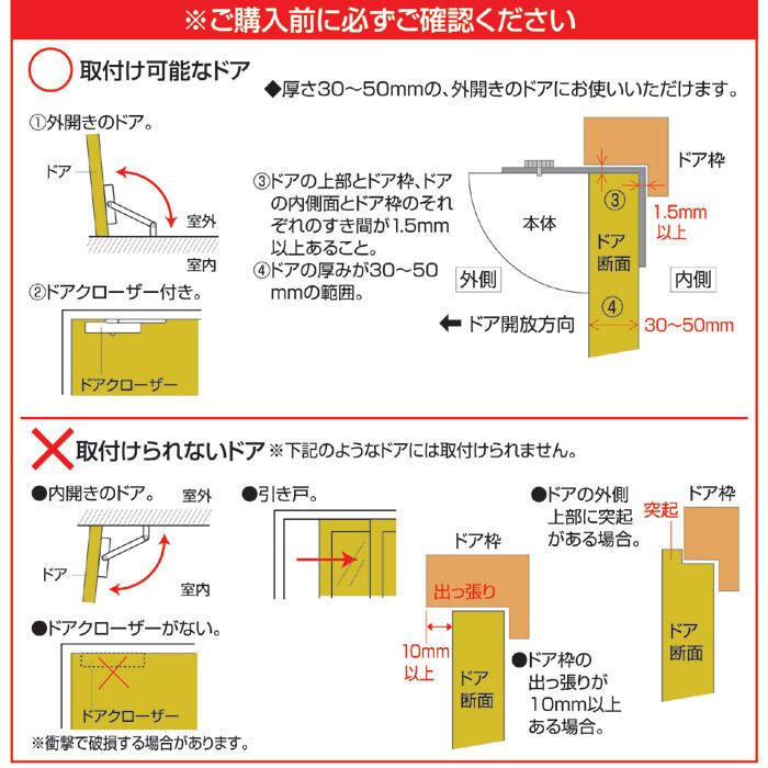 ・ドア枠の出っ張りが外側にドアよりも10ミリ以上出ているタイプや、ドアの外側上部に突起があるタイプには取付けできません。